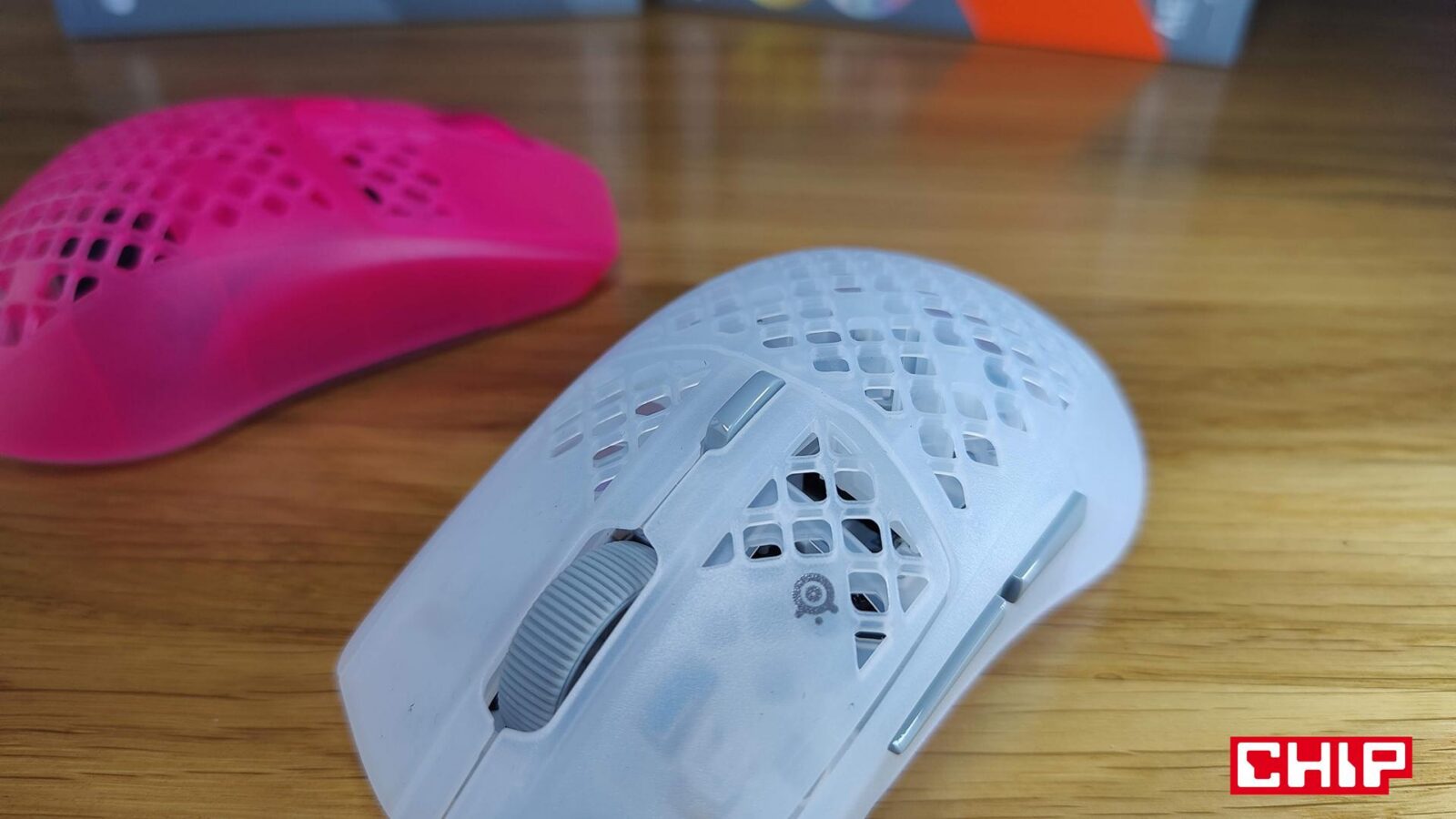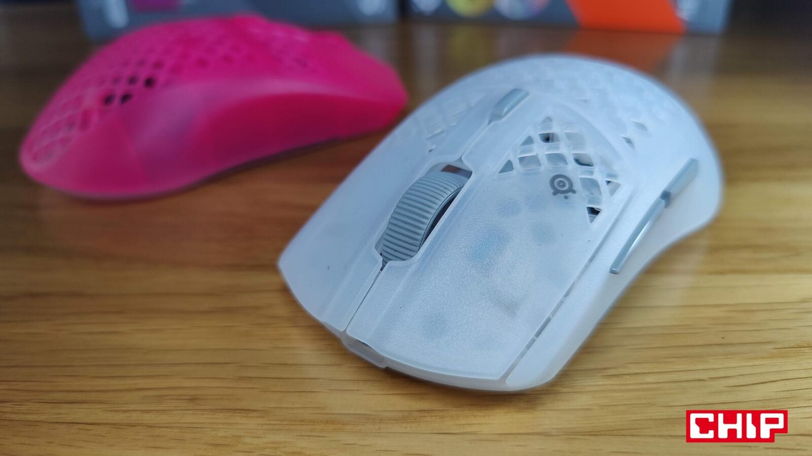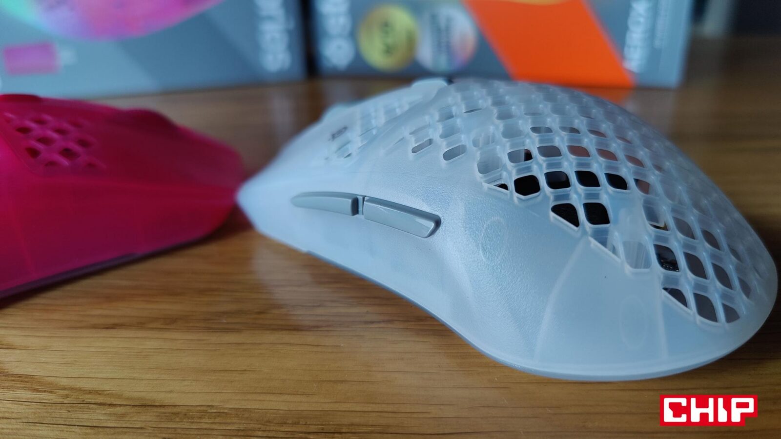 Patrząc na specyfikację, od razu widać, że Aerox 3 Wireless Gen 2 jest naturalnym rozwinięciem podstaw Aerox 3 Wireless, więc większość cech po prostu “odziedziczył”. Czy słusznie? Moim zdaniem tak. Projekt symetrycznej obudowy (rozmiar rzędu 120,5 x 57,9/67 x 21,5/37,9 m) został zachowany w pełni, co widać po rozmieszczeniu perforacji czy ślizgaczy PTFE, ale sam materiał został zmieniony na półprzezroczysty, choć waga pozostała na tym samym poziomie 68 gramów.