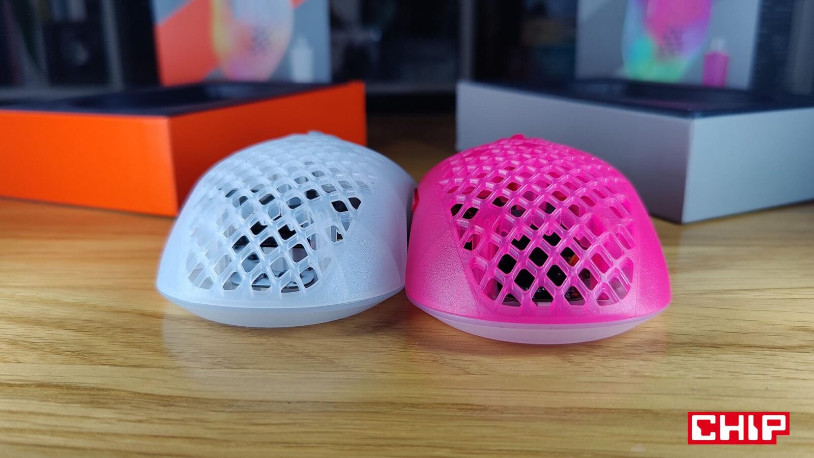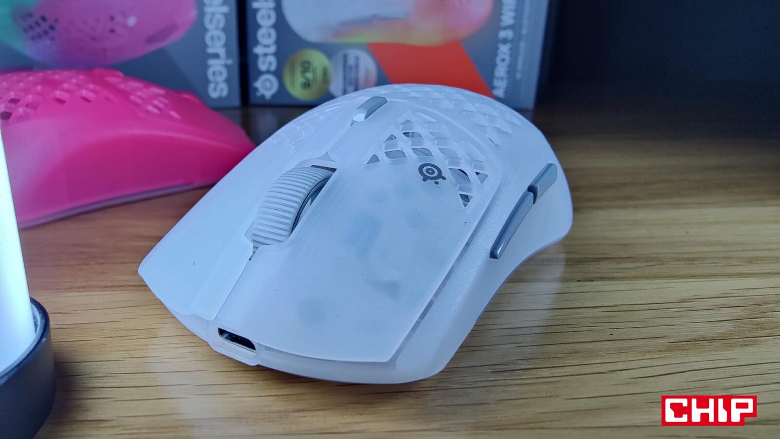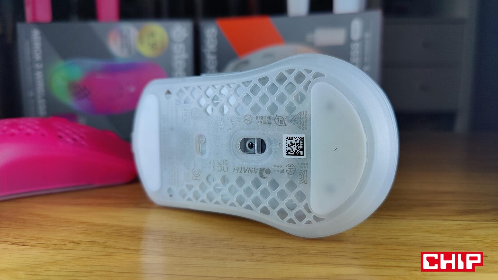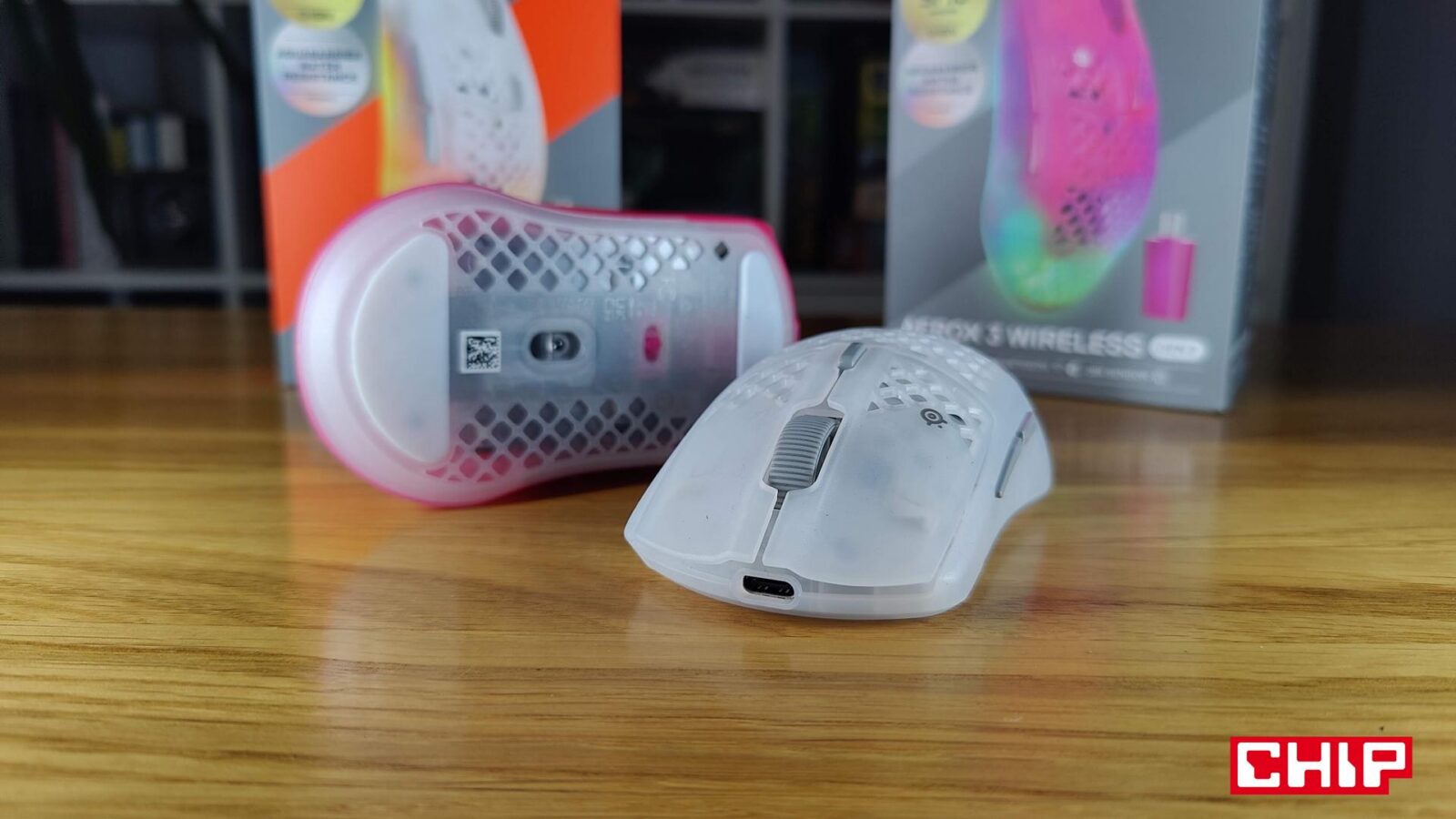 Patrząc na specyfikację, od razu widać, że Aerox 3 Wireless Gen 2 jest naturalnym rozwinięciem podstaw Aerox 3 Wireless, więc większość cech po prostu “odziedziczył”. Czy słusznie? Moim zdaniem tak. Projekt symetrycznej obudowy (rozmiar rzędu 120,5 x 57,9/67 x 21,5/37,9 m) został zachowany w pełni, co widać po rozmieszczeniu perforacji czy ślizgaczy PTFE, ale sam materiał został zmieniony na półprzezroczysty, choć waga pozostała na tym samym poziomie 68 gramów.
