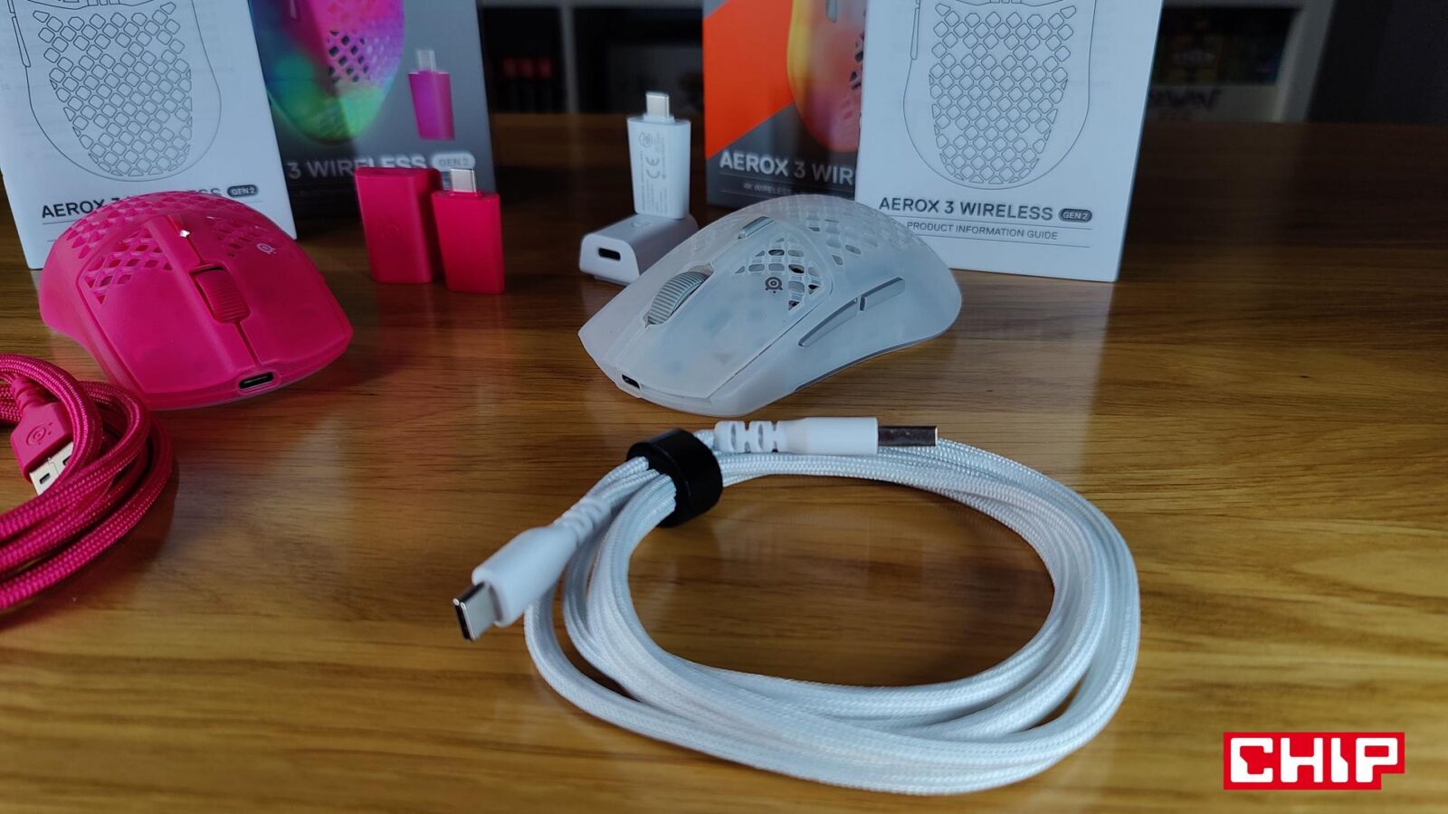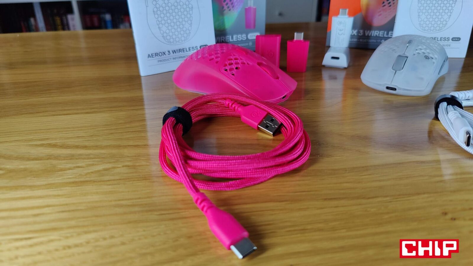 Innymi słowy, nadal mamy do czynienia z jednym z najbardziej precyzyjnych czujników na rynku, a największa zmiana drzemie w samej łączności. Zamiast maksymalnego odświeżania na standardowym poziomie rzędu 1000 razy na sekundę, mamy możliwość skorzystania z poziomu 2-, 3- i 4-krotnie wyższego w przypadku połączenia radiowego, podczas gdy to przewodowe ciągle kończy się na 1000 Hz. Dlatego zresztą w zestawie z myszką znajdziemy nie tylko dobrej jakości przewód, ale też adapter USB-C do USB-C (oba żeńskie) oraz sam odbiornik USB-C. Z adaptera naturalnie nie musimy korzystać, ale jeśli macie komputer oddalony od stanowiska albo po prostu brakuje wam portów USB-C, to właśnie będzie dla Was ratunkiem.