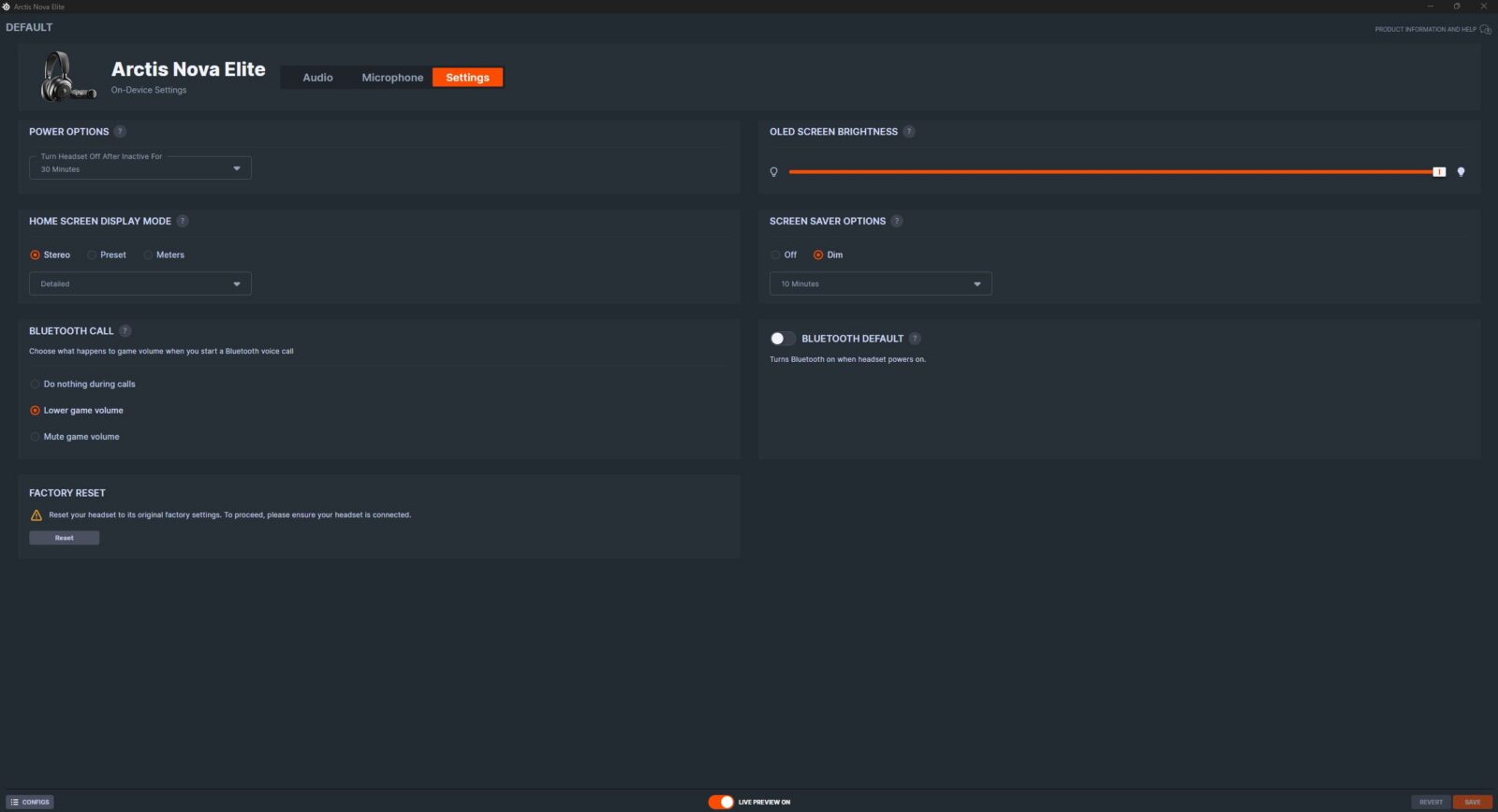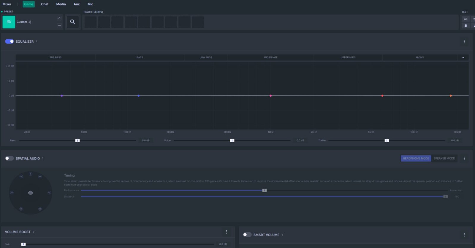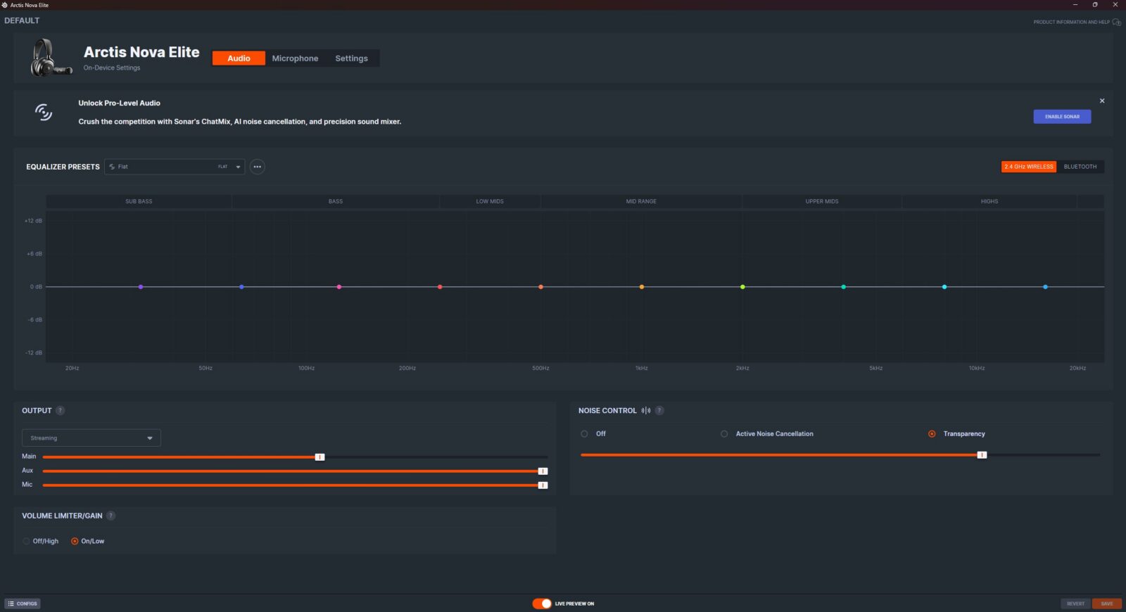 Oprogramowanie SteelSeries GG dostępne na komputery (działa tylko po wpięciu stacji w USB-1) jest bardzo rozbudowane, ma w sobie możliwość dostosowywania wielu szczegółów co do tego, jak Arctis Nova Elite zachowują się na co dzień. Ubóstwiam opcję dzielenia źródeł dźwięku na “grę i chat”, wyłączania ekranu stacji przy bezczynności w celu ochrony panelu OLED, a przede wszystkim specjalny mikser Sonar. Ten służy za centrum do dostosowywania charakteru brzmienia tego modelu za sprawą szeregu predefiniowanych profili z opcją tworzenia swoich niestandardowych i rozdzielenia charakteru na połączenie radiowe i Bluetooth.