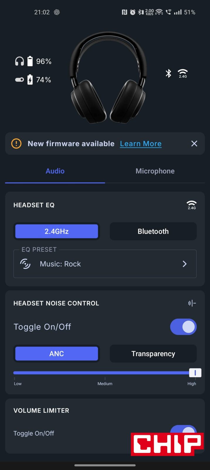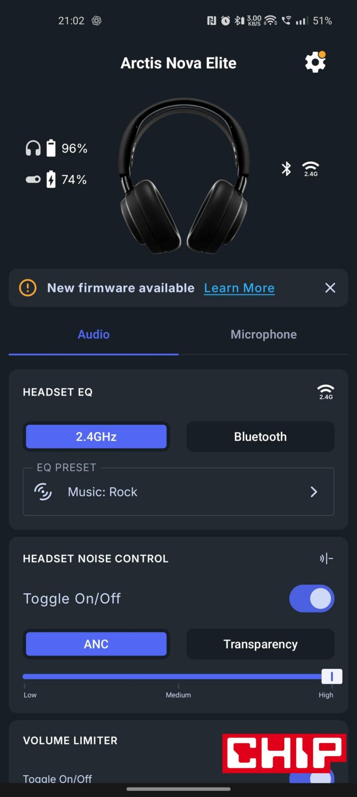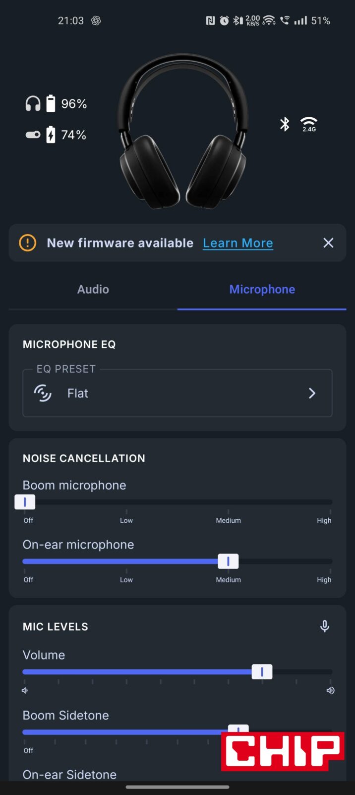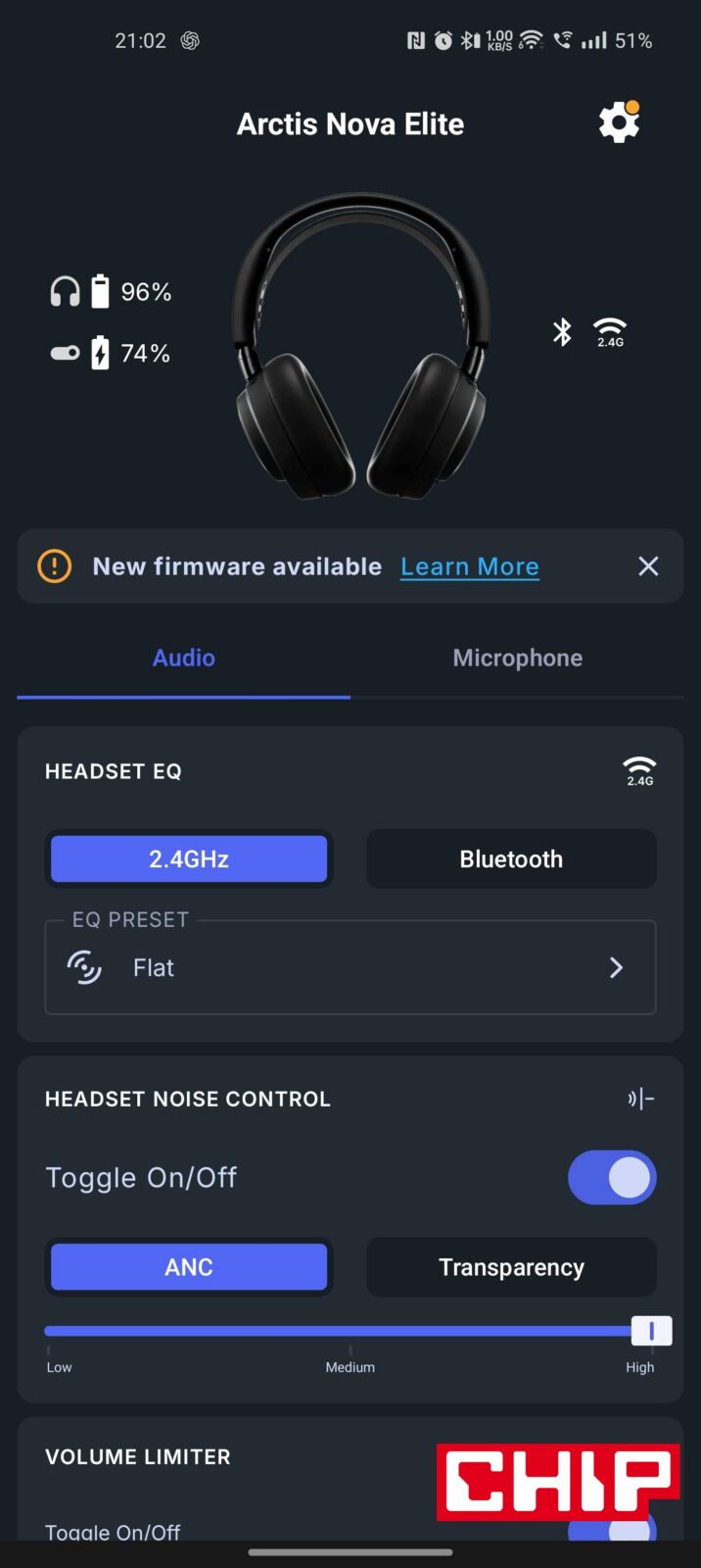 SteelSeries trzeba jednocześnie pochwalić za rzeczywiste uczynienie z Arctis Nova Elite sprzętu gotowego na podbijanie komputerów, jak i smartfonów, bo swego rodzaju “odpowiednik” SteelSeries GG pobierzemy też na smartfony w postaci aplikacji Arctis. Ta nie jest jedynie byle “dostawką” do apki na komputery, bo skupia się na tym, co rzeczywiście warto ustawić z poziomu smartfona, a w tym poziom jasności diody w mikrofonie na wysięgniku oraz to, czy ten w ogóle działa w tym trybie, bo przecież wtedy powinniśmy korzystać z mikrofonu wbudowanego w słuchawki.