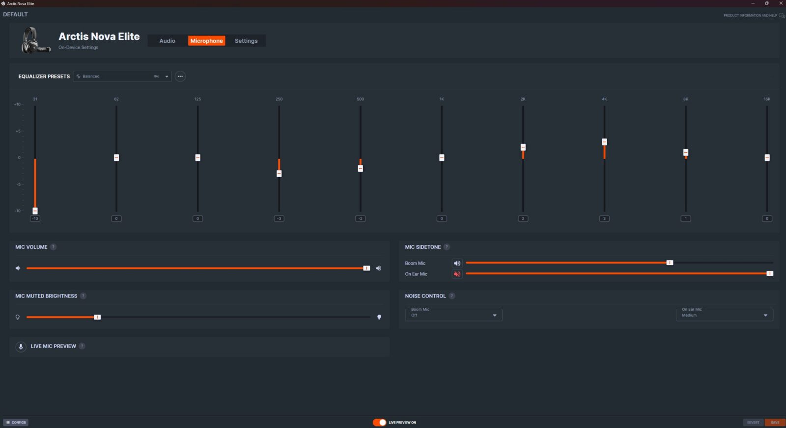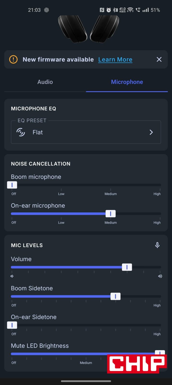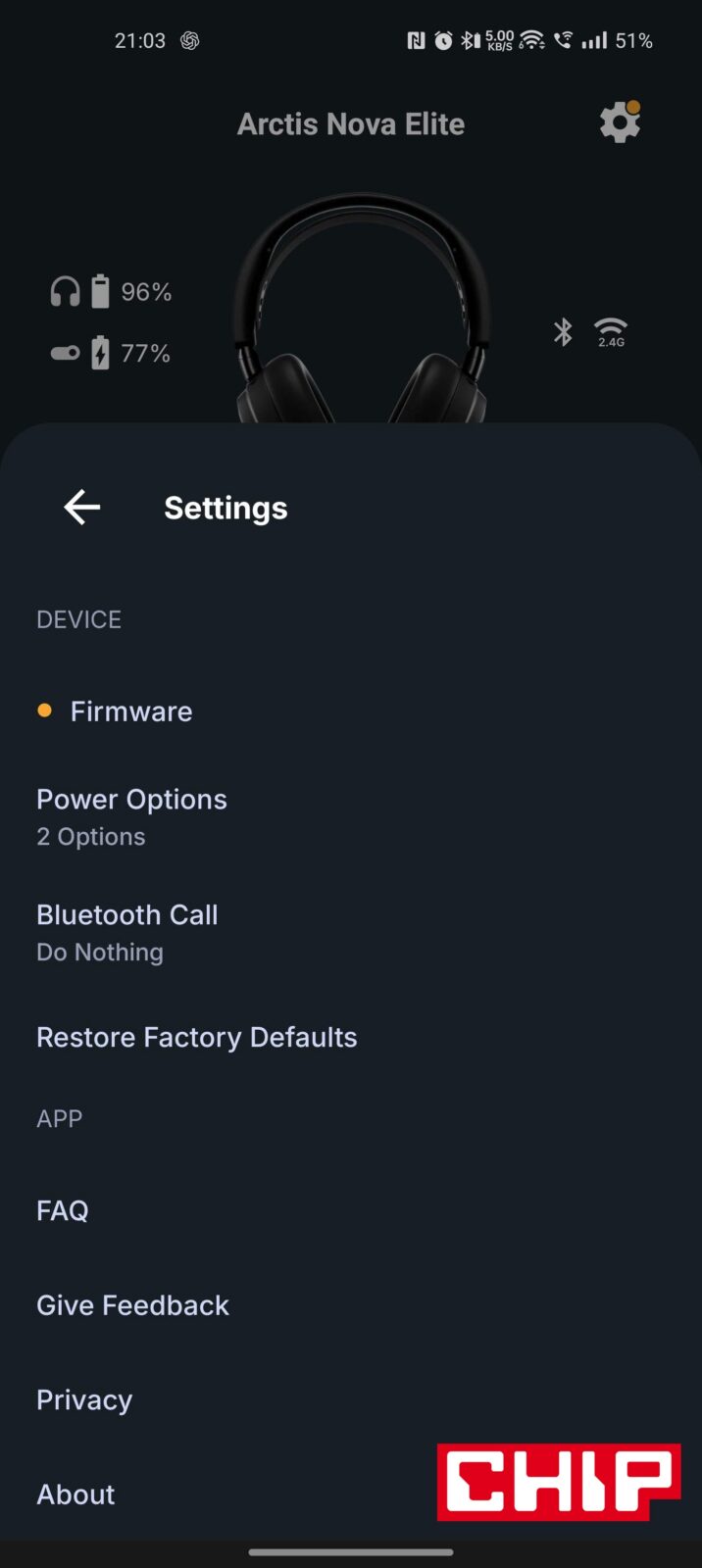 SteelSeries trzeba jednocześnie pochwalić za rzeczywiste uczynienie z Arctis Nova Elite sprzętu gotowego na podbijanie komputerów, jak i smartfonów, bo swego rodzaju “odpowiednik” SteelSeries GG pobierzemy też na smartfony w postaci aplikacji Arctis. Ta nie jest jedynie byle “dostawką” do apki na komputery, bo skupia się na tym, co rzeczywiście warto ustawić z poziomu smartfona, a w tym poziom jasności diody w mikrofonie na wysięgniku oraz to, czy ten w ogóle działa w tym trybie, bo przecież wtedy powinniśmy korzystać z mikrofonu wbudowanego w słuchawki.