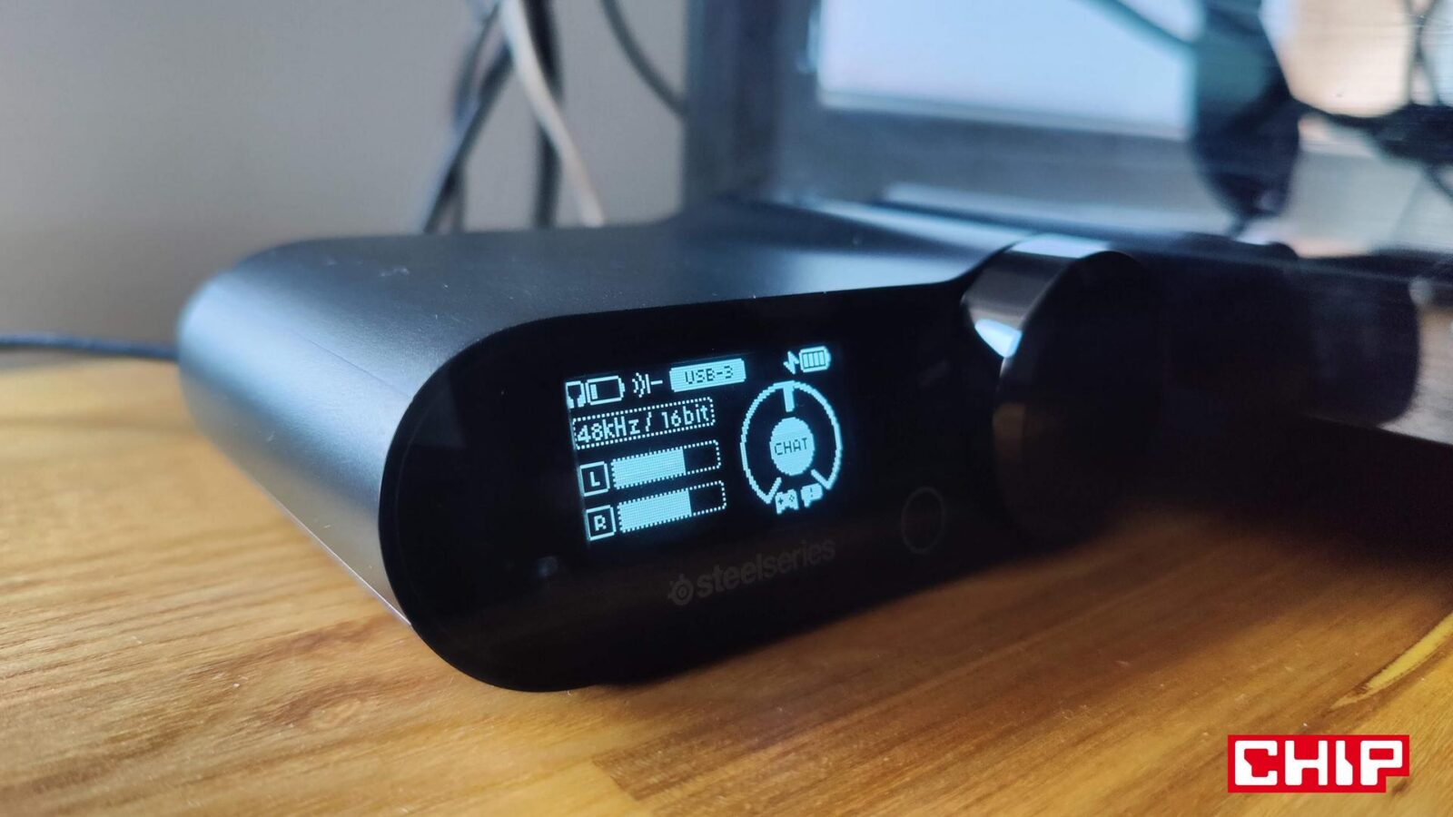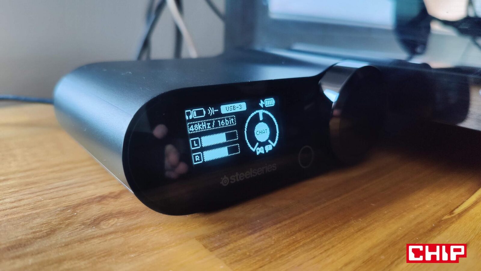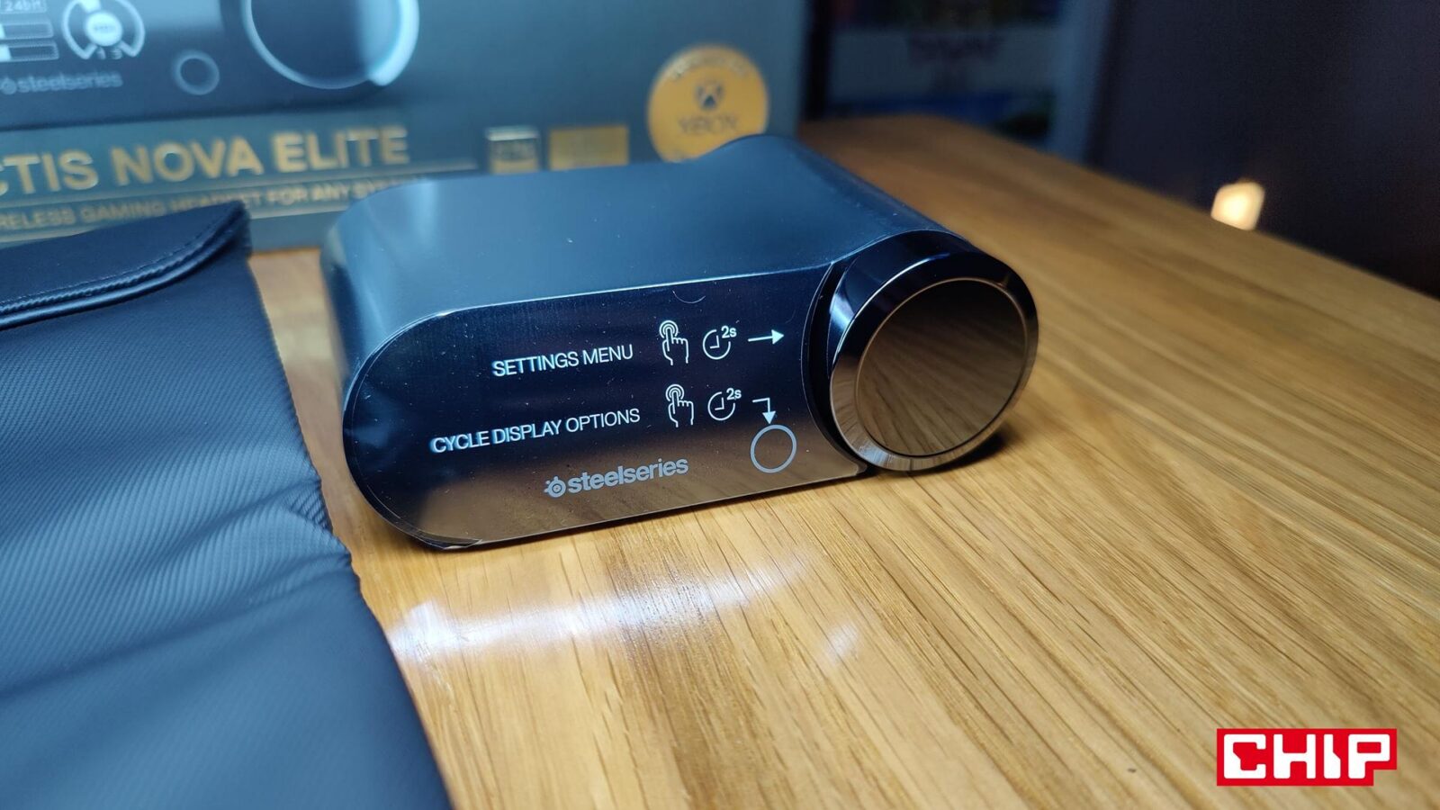W kwestii stacji bazowej również niewiele uległo zmianie. Nadal jest to praktycznie ten sam plastikowy “klocek na biurko” z metalowym pokrętłem, otworem na akumulator oraz monochromatycznym wyświetlaczem OLED na przedzie. Różnice w wykonaniu? Podobne do wspomnianej rolki “elitarne”, czyli wypolerowane wykończenie samego pokrętła. Ciekawiej robi się na tyle, bo nowszy model doczekał się dodatkowego portu USB-C, a więc opcji jednoczesnego wpięcia nie dwóch, a trzech sprzętów pokroju konsol, laptopa czy komputerów. Naturalnie SteelSeries zachowało wejście i wyjście jack 3,5 mm (wejściowe i wyjściowe), a ja ubolewam tylko na tym, że firma nie postarała się, aby uatrakcyjnić nieco wygląd tej stacji, która przez nijaką górną obudowę wygląda… no cóż, nie tak elitarnie, jak przystało na sprzęt za 2699 złotych.