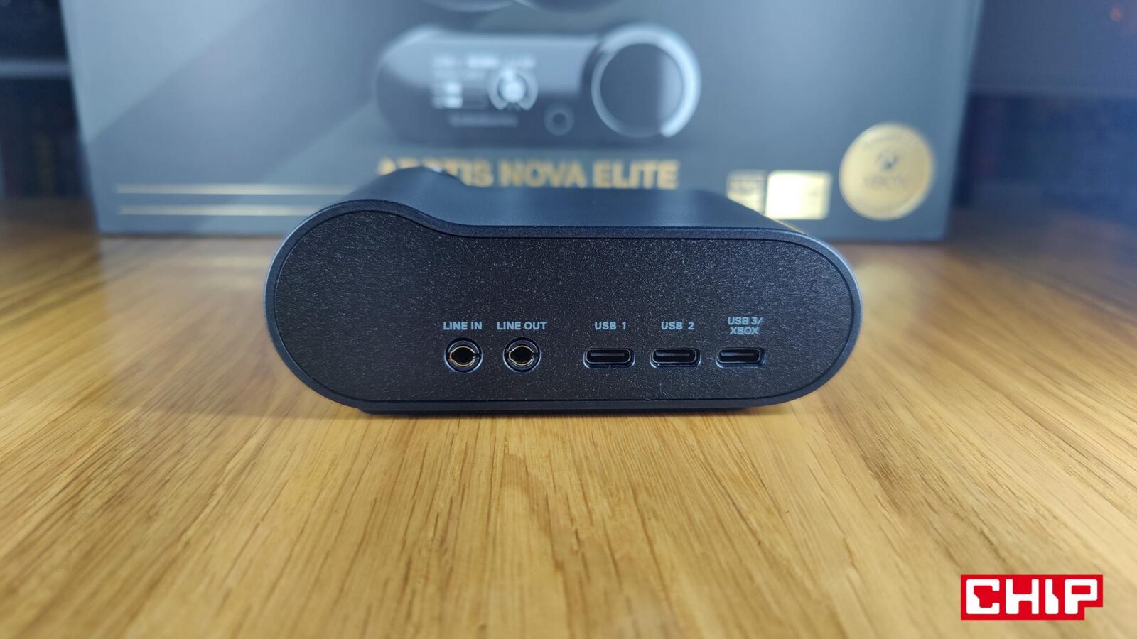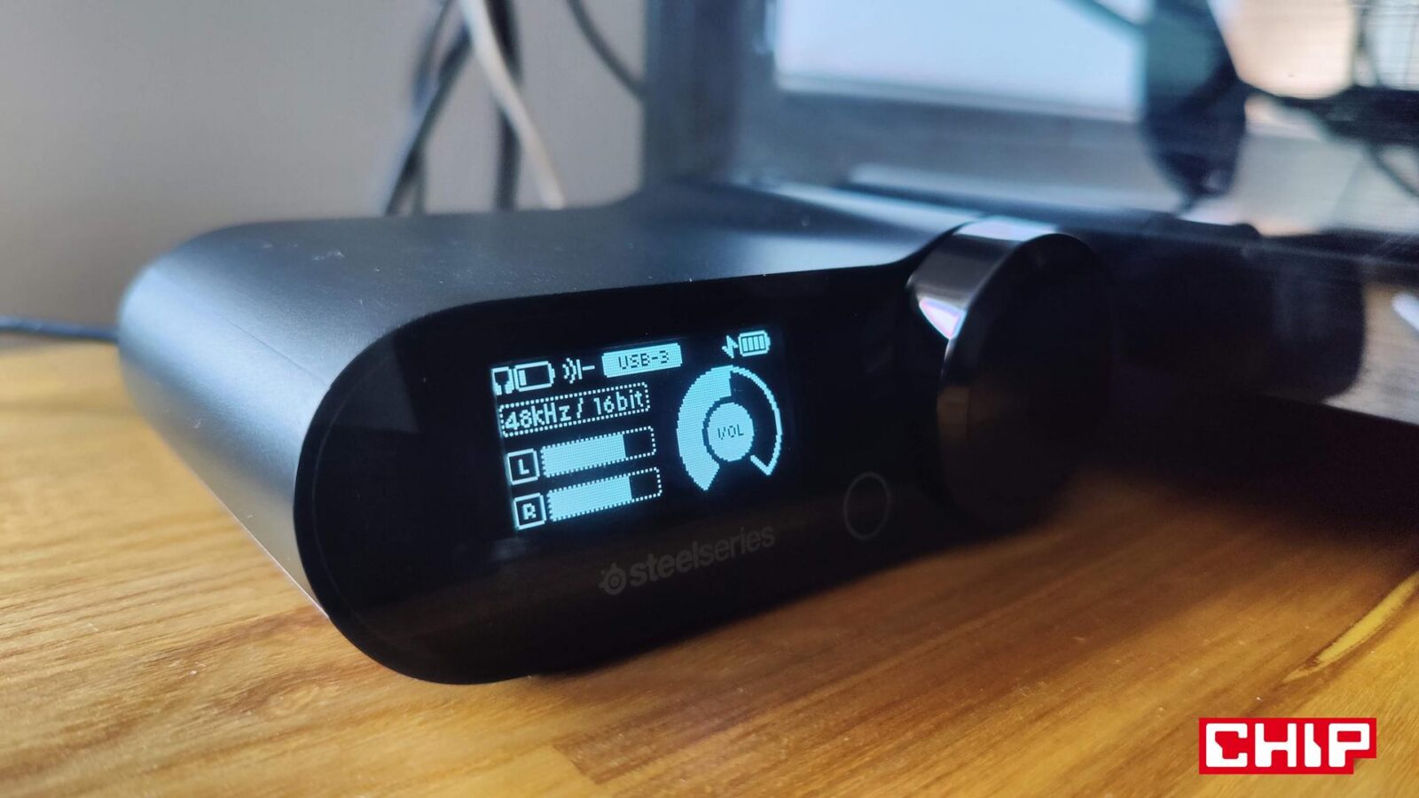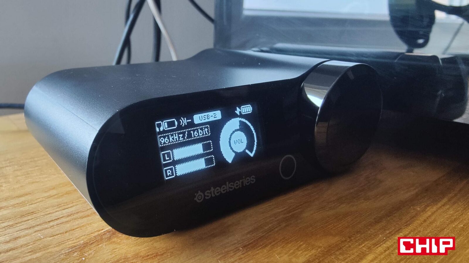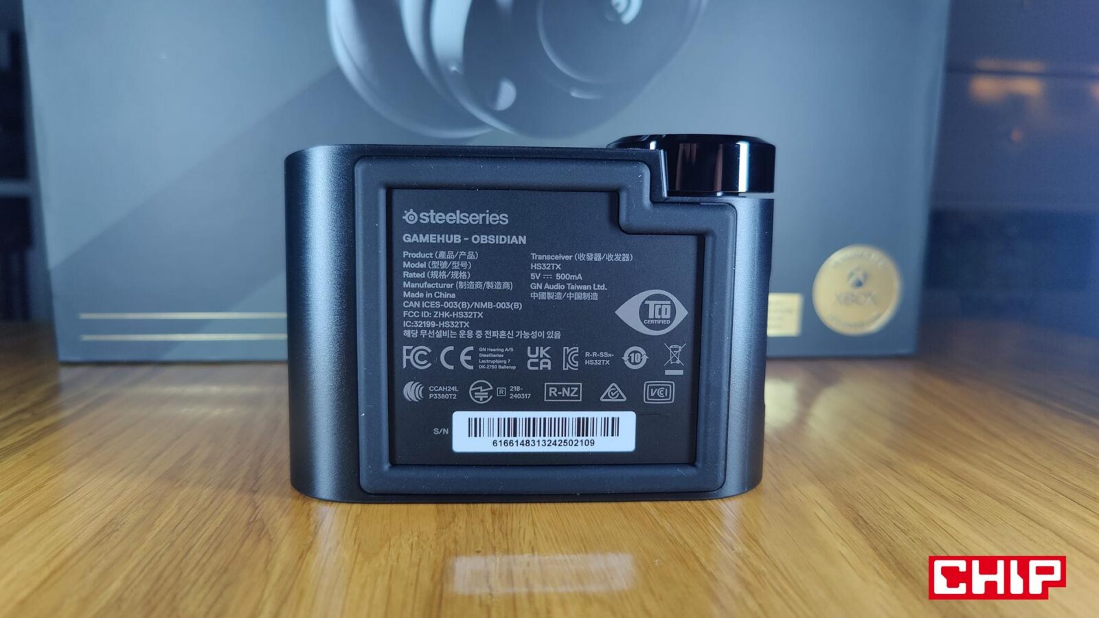 W kwestii stacji bazowej również niewiele uległo zmianie. Nadal jest to praktycznie ten sam plastikowy “klocek na biurko” z metalowym pokrętłem, otworem na akumulator oraz monochromatycznym wyświetlaczem OLED na przedzie. Różnice w wykonaniu? Podobne do wspomnianej rolki “elitarne”, czyli wypolerowane wykończenie samego pokrętła. Ciekawiej robi się na tyle, bo nowszy model doczekał się dodatkowego portu USB-C, a więc opcji jednoczesnego wpięcia nie dwóch, a trzech sprzętów pokroju konsol, laptopa czy komputerów. Naturalnie SteelSeries zachowało wejście i wyjście jack 3,5 mm (wejściowe i wyjściowe), a ja ubolewam tylko na tym, że firma nie postarała się, aby uatrakcyjnić nieco wygląd tej stacji, która przez nijaką górną obudowę wygląda… no cóż, nie tak elitarnie, jak przystało na sprzęt za 2699 złotych.