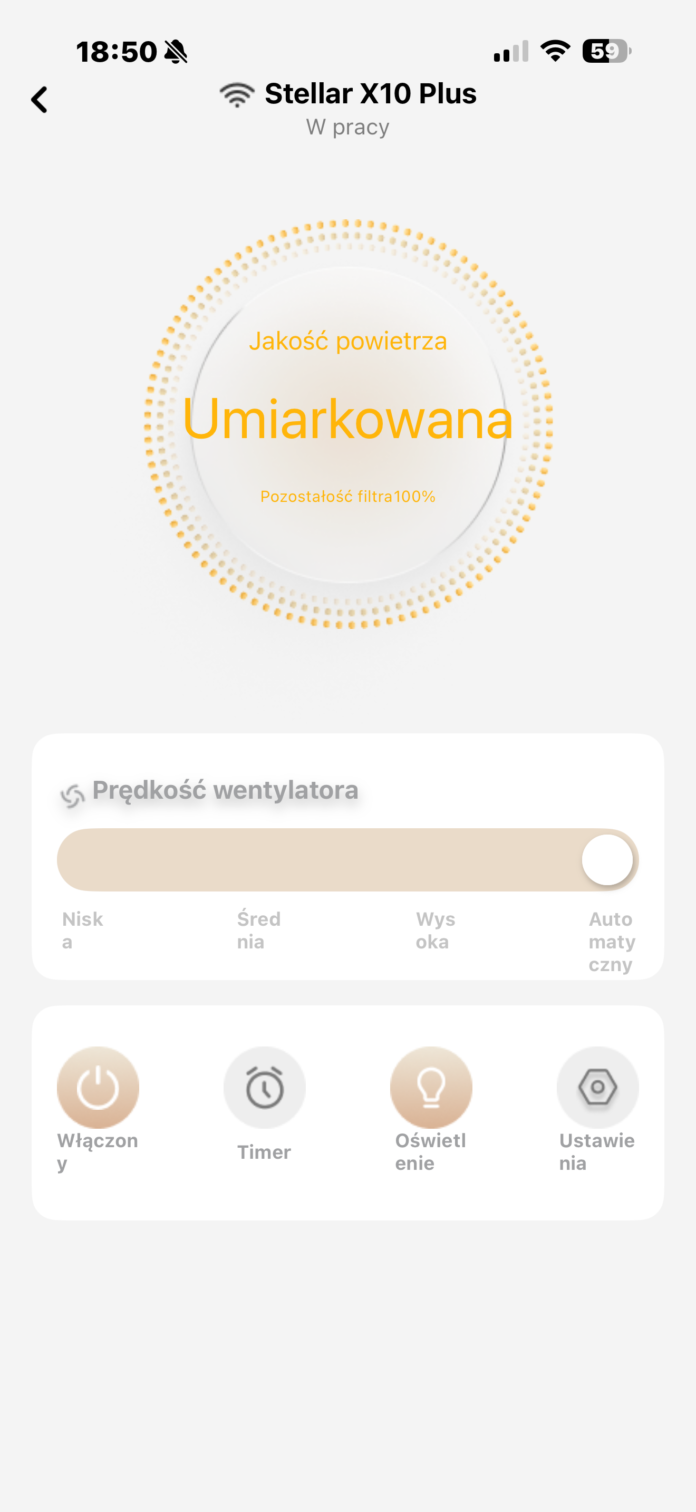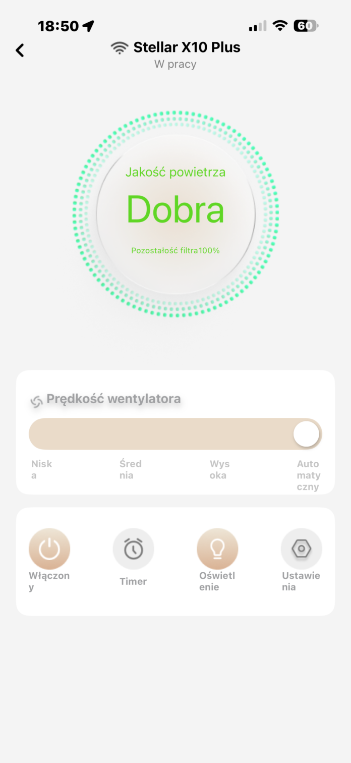 W specyfikacjach bardzo łatwo wrzucić hasło chłodzenie i oczyszczanie w jednym, a potem zostawić użytkownika z czymś, co jest przeciętnym oczyszczaczem i przeciętnym wiatrakiem. Tutaj przynajmniej widać pomysł. X10 Plus ma płynną, bezstopniową regulację przepływu powietrza oraz dwa tryby pracy: automatyczny z trzema biegami i ręczny z bardziej swobodną regulacją. Przy takim urządzeniu najczęściej nie potrzeba wielkiego podmuchu. Potrzeba łagodnego ruchu powietrza, który poprawia komfort w nocy albo przy zasypianiu, ale nie zachowuje się jak wentylator biurowy z upałów w trakcie sierpnia.