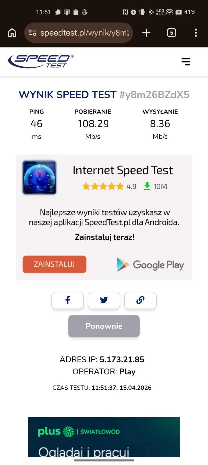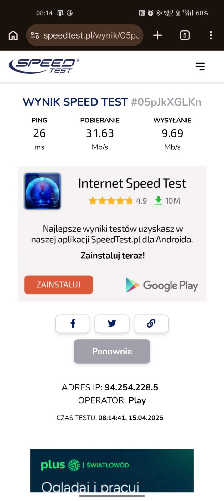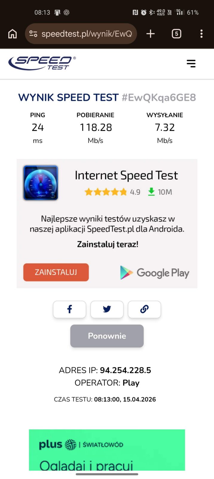 Opóźnienie jest naturalnie wyższe z racji jednego dodatkowego “skoku” między urządzeniem, a Internetem, ale ogólna stabilność transferu pozostaje wyższa, jeśli idzie o średnią. Akumulator dostaje jednak w takim scenariuszu spore wyzwanie, bo średnio na godzinę przy aktywnej sieci 5 GHz odnotowałem spadek o średnio 12-15% na godzinę.