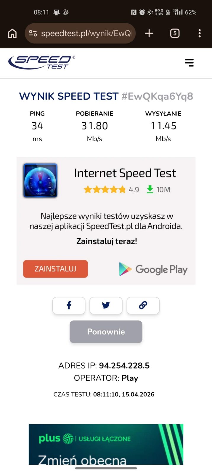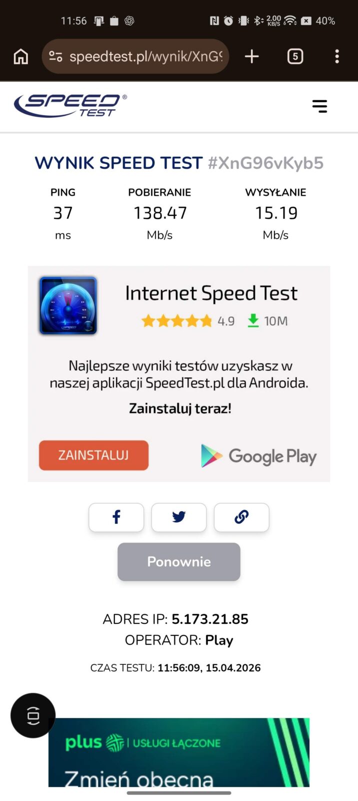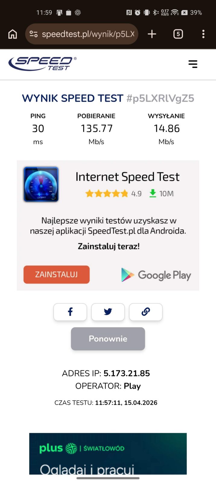Opóźnienie jest naturalnie wyższe z racji jednego dodatkowego “skoku” między urządzeniem, a Internetem, ale ogólna stabilność transferu pozostaje wyższa, jeśli idzie o średnią. Akumulator dostaje jednak w takim scenariuszu spore wyzwanie, bo średnio na godzinę przy aktywnej sieci 5 GHz odnotowałem spadek o średnio 12-15% na godzinę.
