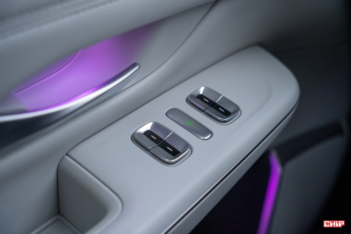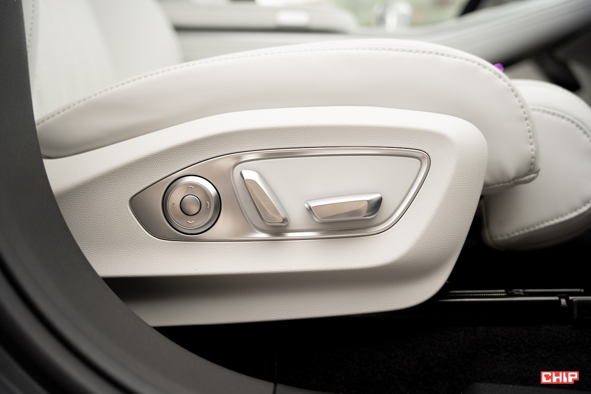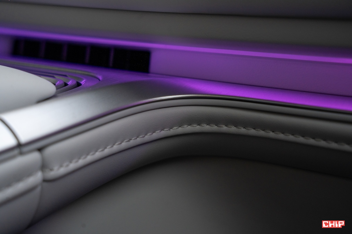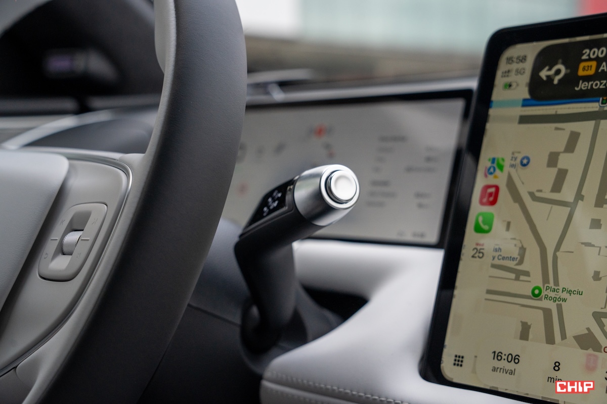 Podoba mi się również kierownica, która jest w teorii bardzo prosta, a w praktyce… skrywa coś wyjątkowego. Wygląda jak wolant, do którego dodano elementy standardowej kierownicy. Przycisków jest bardzo mało, a towarzyszą im pokrętła — coś, co doskonale znamy z Tesli. W białym wykończeniu (jak widzicie na zdjęciach) robi to spore wrażenie, a dodając do tego wspomniany już minimalizm, ilość i jakość ekranów, design wystających głośników na desce rozdzielczej, podświetlenie ambientowe i przestrzeń, jaką mamy, dostajemy naprawdę high-endowe wręcz auto, w którym świetnie się czułem.