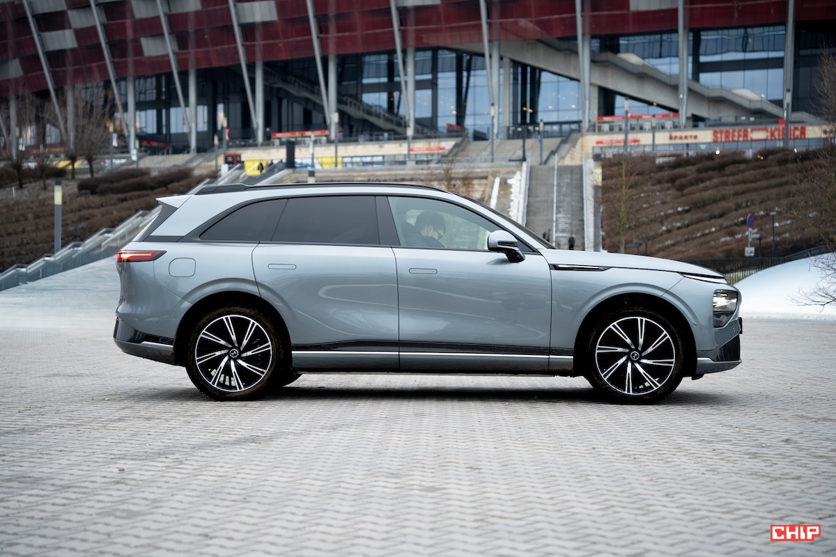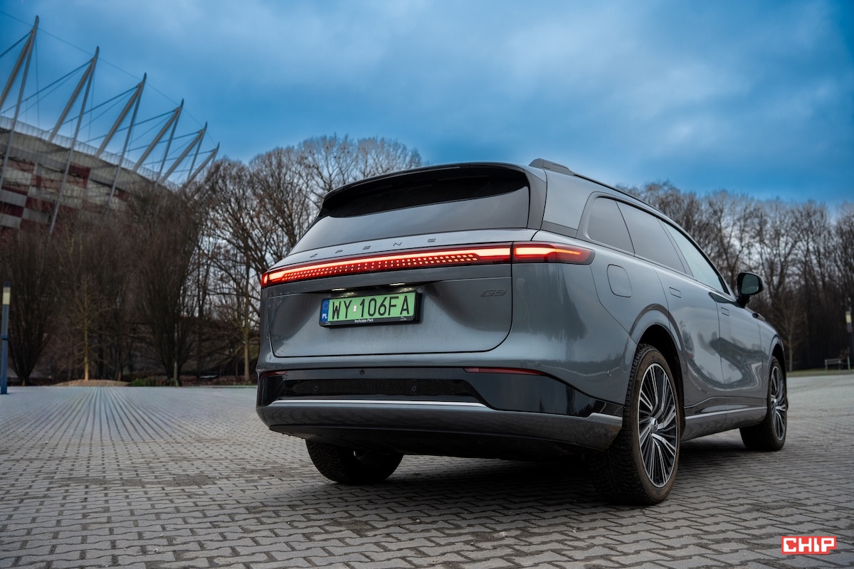 Na pierwszy rzut oka XPENG G9 może trochę przypominać Teslę Model Y Juniper za sprawą cienkiego paska świetlnego z przodu i nieco większego z tyłu (chociaż G9 było znacznie wcześniej na rynku), trochę Range Rover, ale szukanie jakiejkolwiek nadmiernej inspiracji w tym przypadku jest zbędne. G9 wygląda jak naprawdę dumny i dobrze przemyślany SUV. Chociaż przy tych gabarytach przydałaby się tylna skrętna oś, bo w mieście i — jak sam się przekonałem — ciasnych parkingach, potrafi to być prawdziwy game-changer. Do samej sylwetki samochodu jednak zwyczajnie trudno się przyczepić i wygląda ona naprawdę fantastycznie.