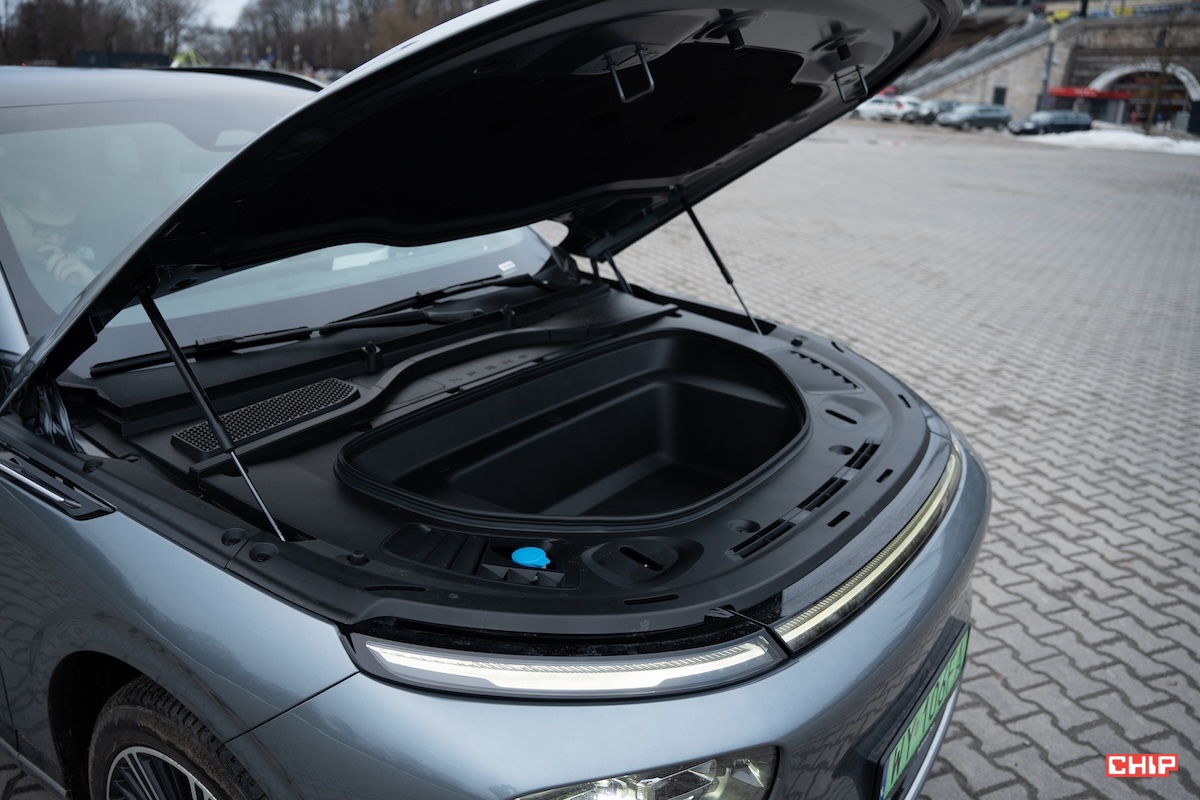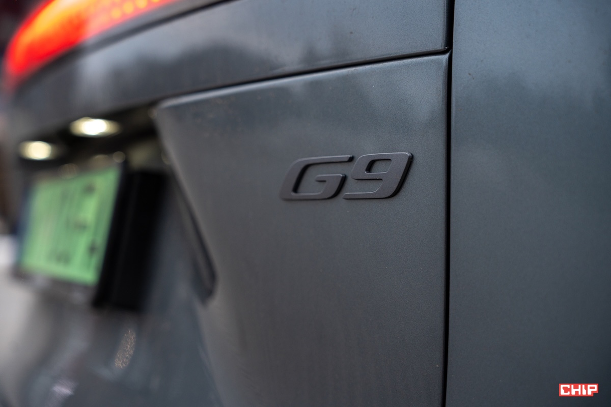 Na tym tle bardzo dobrze wypada też sama przestrzeń. Bagażnik ma 660 litrów, z przodu we frunku dostajemy dodatkowe 71 litrów, a po złożeniu tylnej kanapy pojemność rośnie do 1576 litrów. Do tego dochodzi obciążalność elektrycznie rozkładanego haka holowniczego do 1500 kg i nośność bagażnika dachowego na poziomie 75 kg. To wszystko są parametry, które przypominają, że choć G9 chce być samochodem bardzo nowoczesnym i mocno stylowym, nie zapomina o zwyczajnej praktyczności dużego rodzinnego SUV-a.
