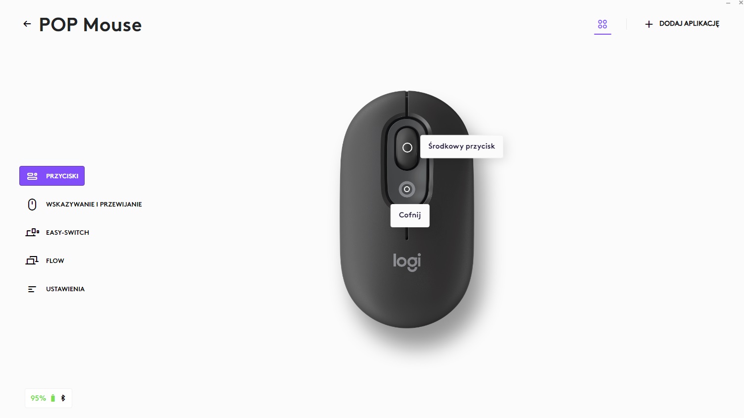 Drugi element to pokrętło MagSpeed, za które ubóstwiam MX Master 3 (i MX Anywhere również). W POP Mouse mamy SmartWheel, czyli nieco inne, ale jednocześnie podobne rozwiązanie. MagSpeed działa jak koło zamachowe. Czyli im mocniej zakręcimy pokrętłem, tym szybciej się kręci i w krótkim czasie pozwala przewijać długie strony lub dokumenty. SmartWheel dopasowuje tempo obrotu do tego, co aktualnie mamy otwarte na komputerze. Myszka widzi, że mamy otwarty długi dokument i pozwala mocniej zakręcić pokrętłem. Jeśli otworzymy krótką stronę internetową, będzie przewijać ją wolniej i bardziej precyzyjnie. Jest to jakaś namiastka MagSpeed, która działa zaskakująco dobrze.