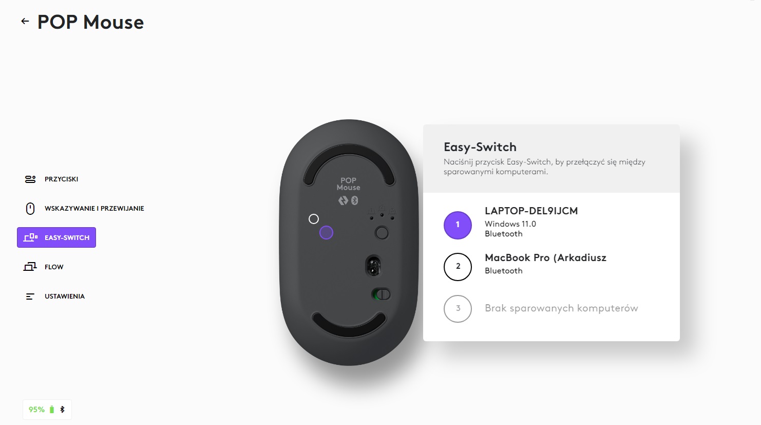 Logitech POP Mouse może być sparowania z trzema urządzeniami jednocześnie przez Bluetooth lub odbiornik USB i mamy tu znaną dobrze użytkownikom myszek Logitech funkcję Flow. Pozwala na przesuwanie kursora pomiędzy ekranami dwóch zupełnie różnych komputerów, a nawet przesyłanie pomiędzy nimi plików lub obrazów. Wystarczy złapać plik na jednym ekranie i przesunąć się na ekran drugiego.