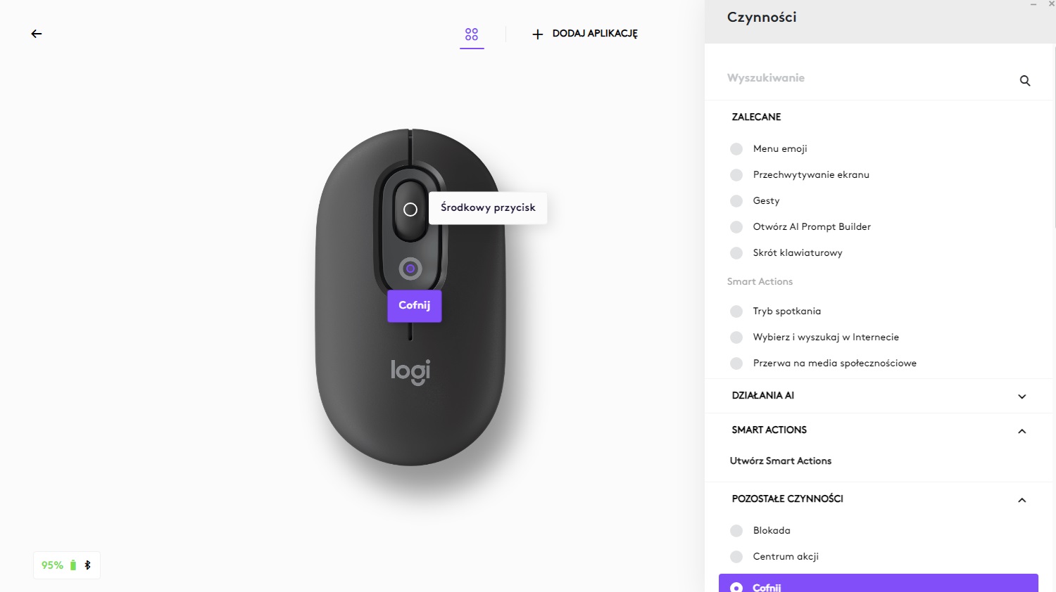 Ok nie mam, ale nie mogę od nich uciec, bo aplikacja Logitech Options sugeruje przypisanie do przycisków otwieranie jakiejś aplikacji AI, jak ChatGPT, ale nie trzeba z tego korzystać. Pierwszą nowością, która pojawia się w POP Icon Keys są Smart Actions. Po wciśnięciu przycisku wykonywane są ustawione przez nas akcje. Logitech sugeruje nam kilka gotowych ustawień, jak tryb spotkania, pracy czy relaksu. Przykładowo tryb spotkania może nam wyciszyć wszystkie powiadomienia, ustawić odpowiedni status w komunikatorach i uruchomić Skype’a. W trybie pracy możemy jednym przyciskiem uruchomić zestaw aplikacji, których używamy do pracy, a tryb relaksu wyłączy nam wszystkie aplikacje służbowe otwierając Netflixa czy Tidala. Wszystko co przypiszemy zależy wyłącznie od nas.