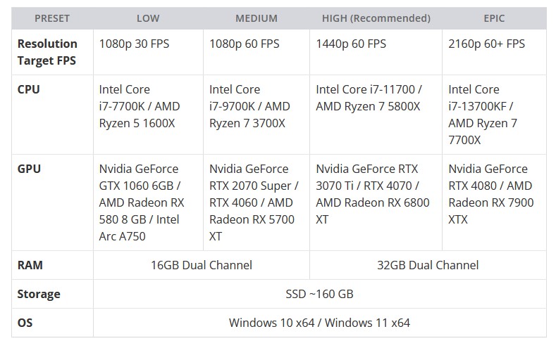 Jednak zalecenia GSC Game World dotyczące pamięci RAM i wolnego miejsca mogą zaskoczyć graczy o niższych wymaganiach sprzętowych. Gra we wszystkich zaprezentowanych ustawieniach wstępnych wymaga 16 GB pamięci i co najmniej 160 GB wolnego miejsca na dysku.
