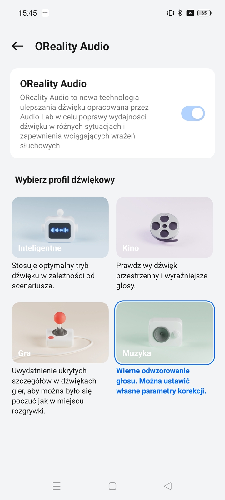 Realme 12+ 5G ma głośniki stereo i grają one całkiem nieźle i dość głośno zarazem. Mają jednak 3 wady. Po pierwsze dolny głośnik gra nieco głośniej, po drugie na najwyższych poziomach głośności barwa dźwięku ulega spłaszczeniu, a po trzecie wreszcie – na głośnikach nie działa technologia Oreality, która w założeniu ma poprawiać jakość dźwięku. Dostępne jest tylko kilka profili dźwiękowych, z których o dziwo najlepiej wypada „kino”.