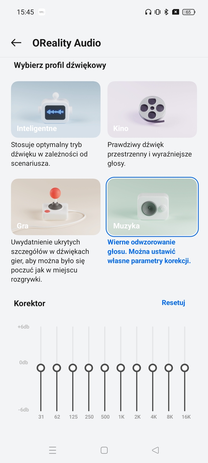 Po podłączeniu słuchawek pod gniazdo miniJack dźwięk technologia Oreality jest już dostępna, ale w praktyce z tego co zauważyłem, to tylko podbija niskie tony. Co prawda w dobrym stylu, ale jednak tylko niskie tony (a przynajmniej tylko to słychać na moich słuchawkach Sennheisera. W ustawieniach znajdziemy jeszcze manualny equalizer.
