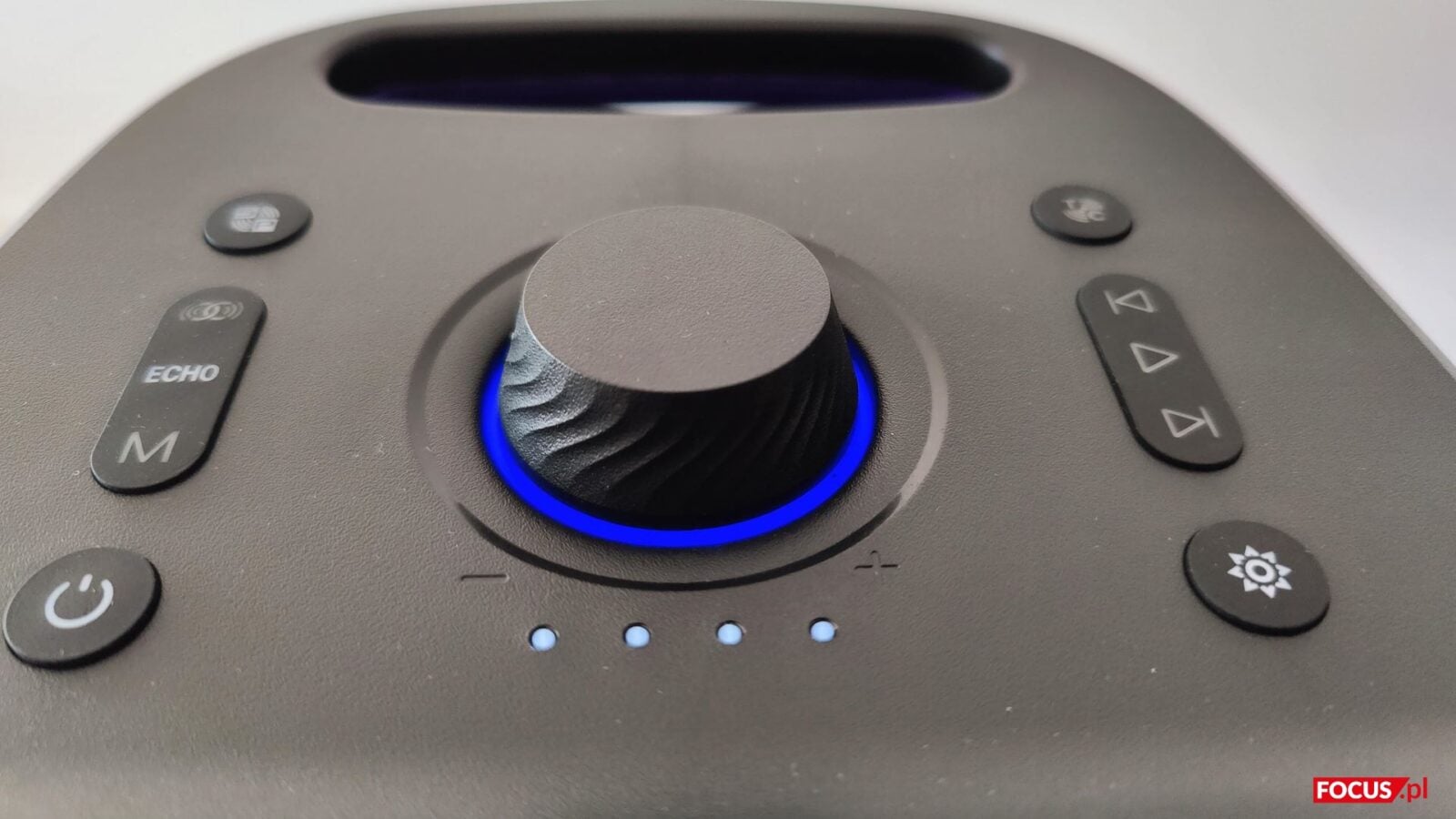 Wśród nich znalazł się ten do włączania i wyłączania głośnika, sterowania playlistą, podświetleniem i opatentowanym equalizerem SoundPulse, który w przypadku Halo 200 spisuje się fenomenalnie, pozytywnie wpływając na ogólne brzmienie, choć muszę podkreślić, że jego efekt ten jest bardzo subiektywny. Na górze znalazło się też centralnie umieszczone pokrętło głośności, które jest otoczone podświetlanym okręgiem w kolorze niebieskim, ale niestety to nie ono, a największe podświetlane koło na przedniej części (pod metalową siatką) wskazuje aktualny poziom głośności. Jeśli z kolei idzie o poziom naładowania, ten zdradzają ciągle świecące się cztery diody LED obok pokrętła.