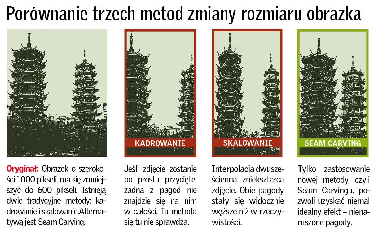 Edytory fotografii staną się teraz sprytne: Seam Carving podczas zmniejszania obrazka analizuje jego zawartość. Ważne elementy fotografii zostają zachowane, a usuwane są tylko nieistotne. Metoda ma nawet zostać zintegrowana z Photoshopem.