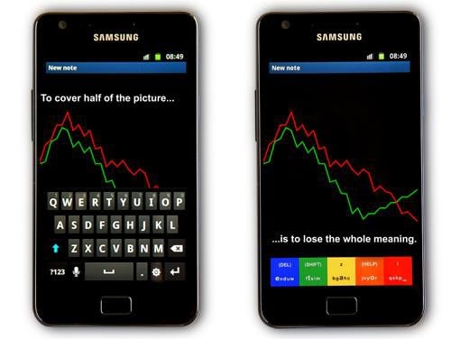 Klawiatura ETAOI, składająca się z zaledwie pięciu różnokolorowych przycisków zajmujących niewielki pasek na dole ekranu, wykorzystuje możliwości, które pojawiły się wraz z nową generacją ekranów dotykowych.